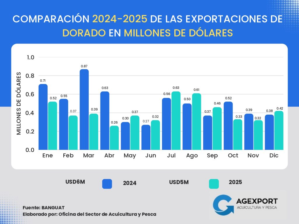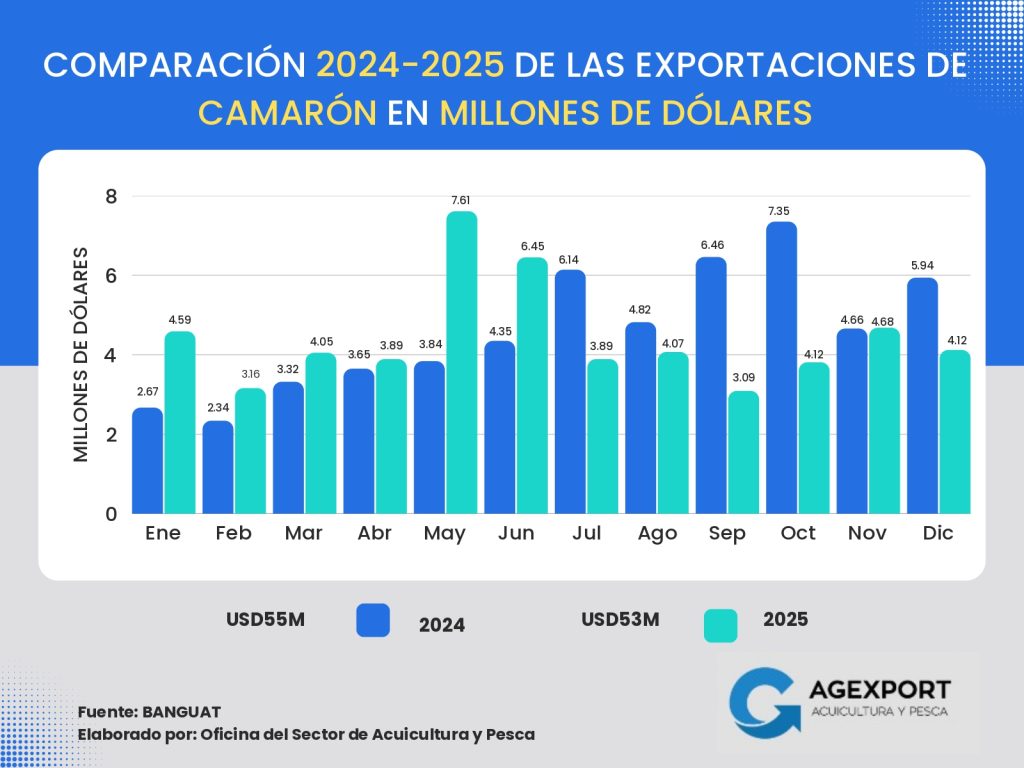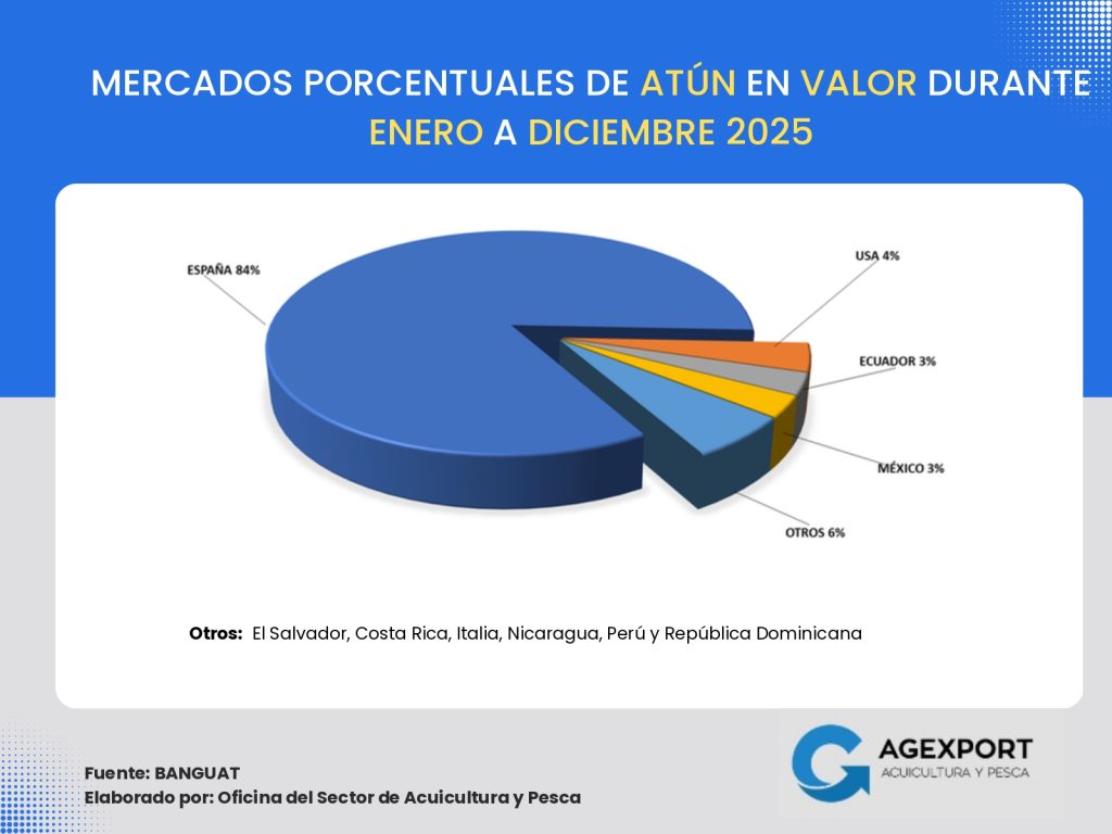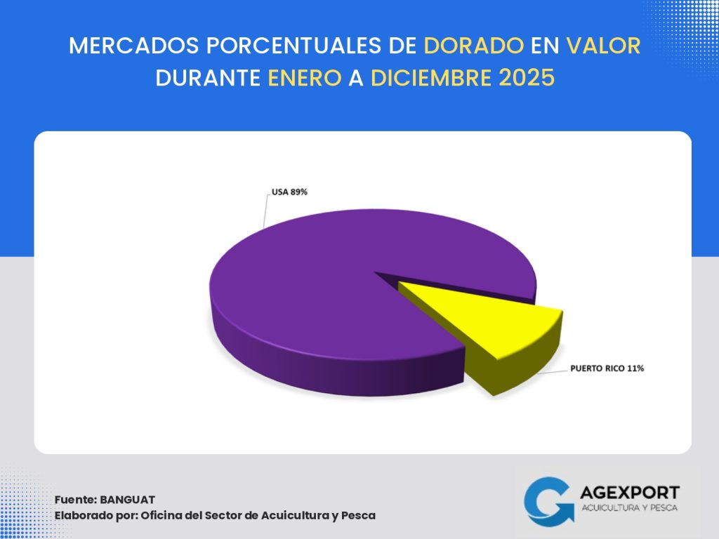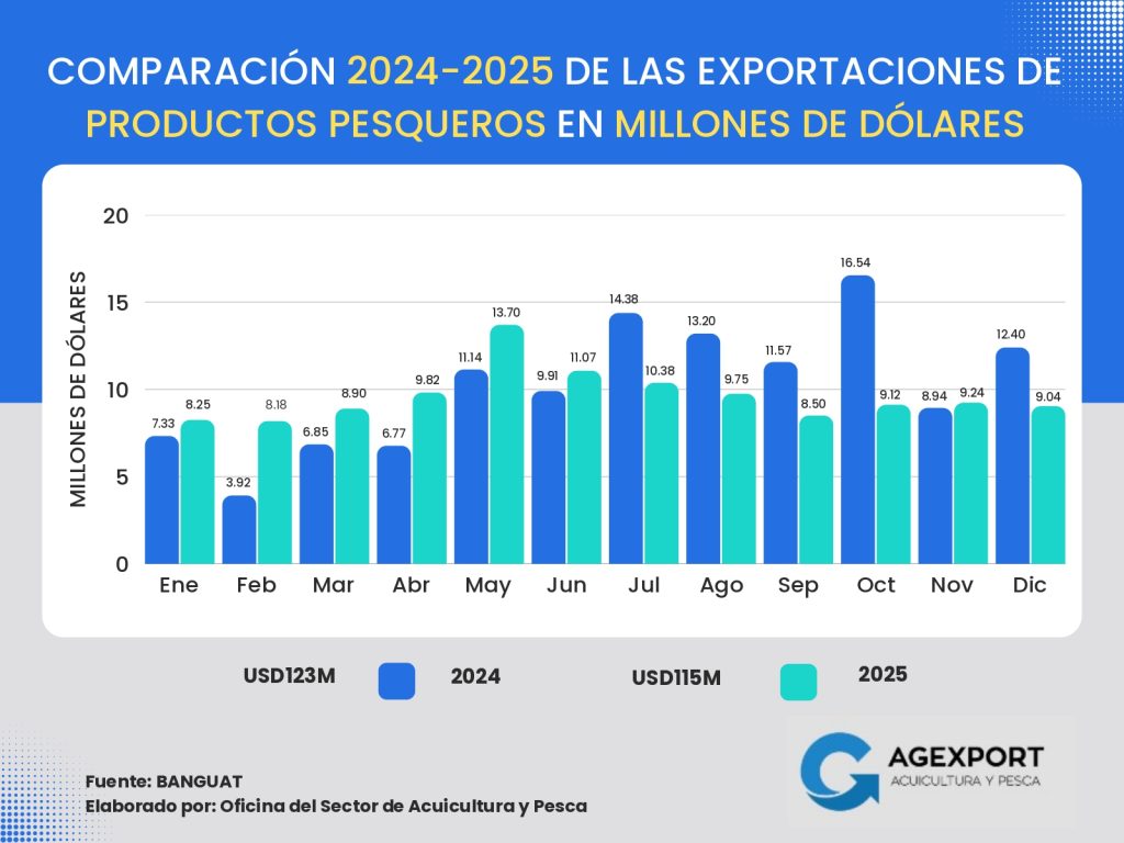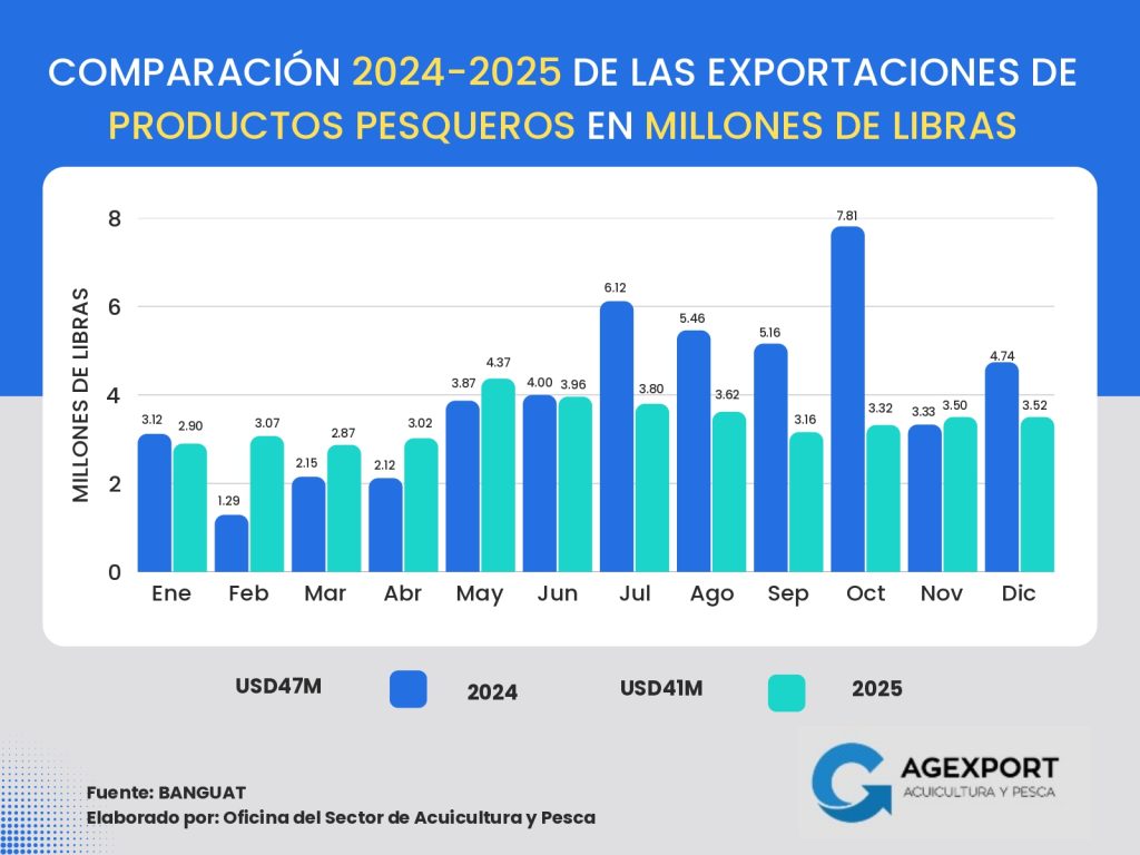 Volumen: A diciembre de 2025 se han exportado 41 millones de libras. Se observa una disminución del 13 % en el volumen exportado de productos pesqueros en comparación con el año 2024 (47 millones de libras a diciembre de 2024).