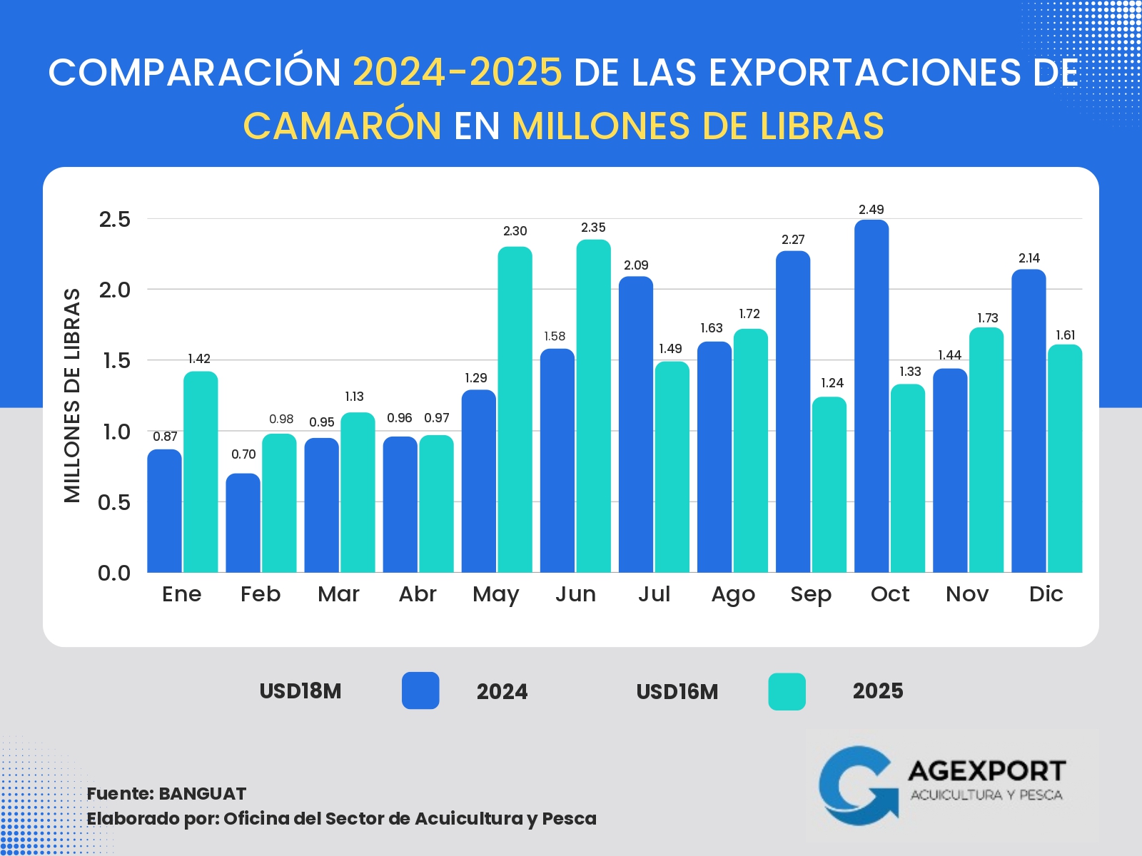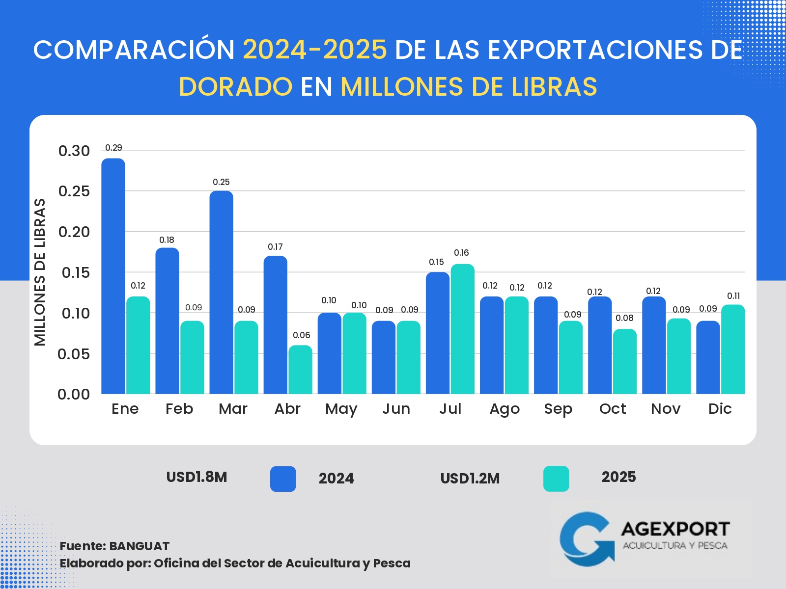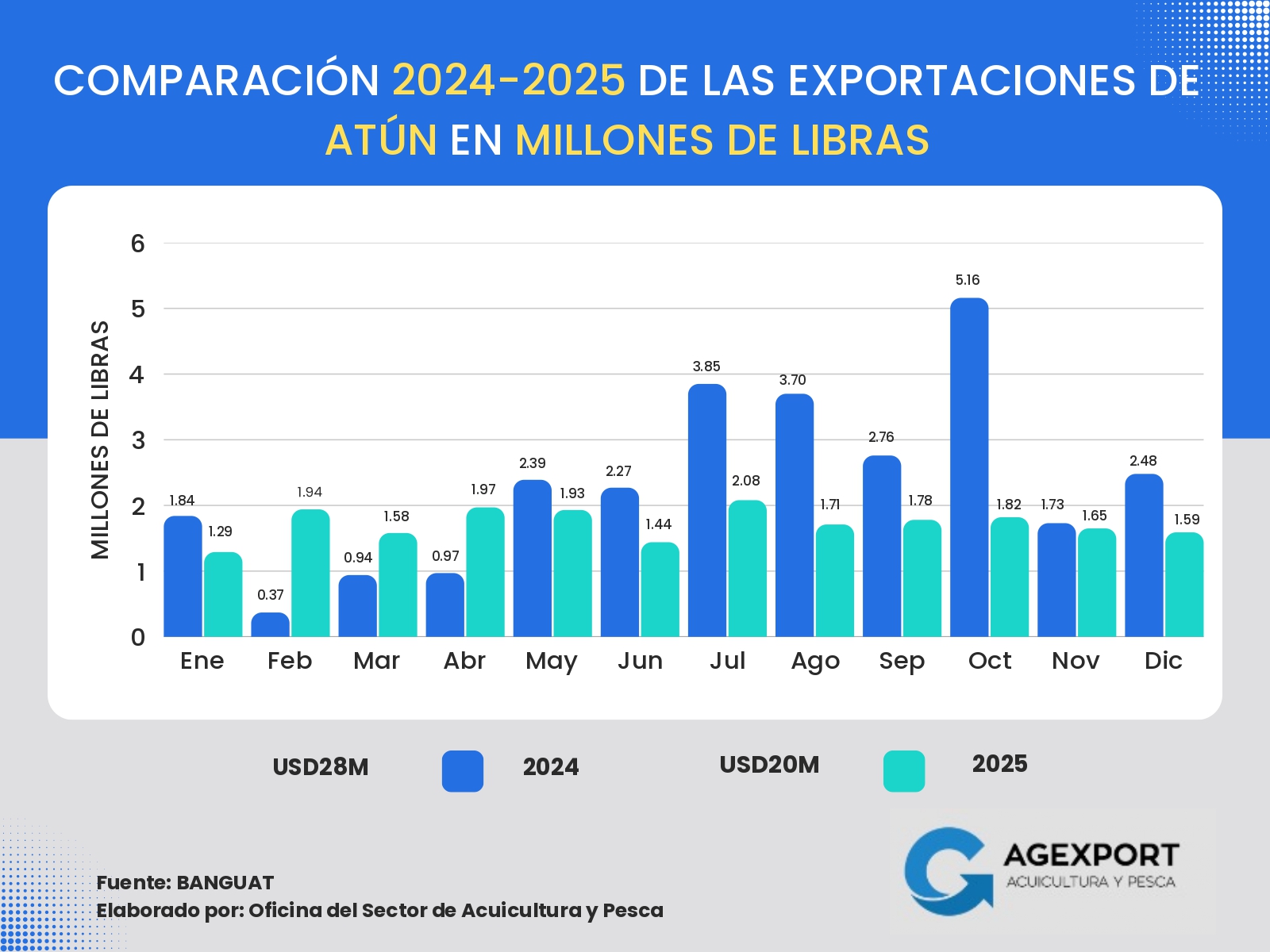 Volumen: A diciembre de 2025 se han exportado 41 millones de libras. Se observa una disminución del 13 % en el volumen exportado de productos pesqueros en comparación con el año 2024 (47 millones de libras a diciembre de 2024).