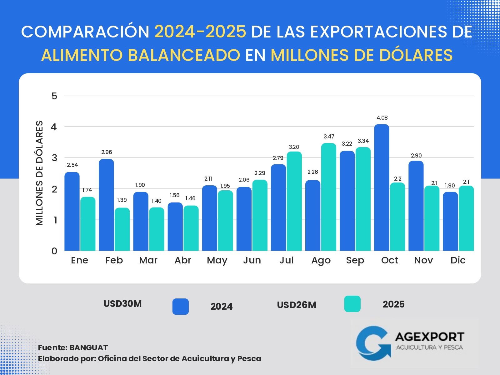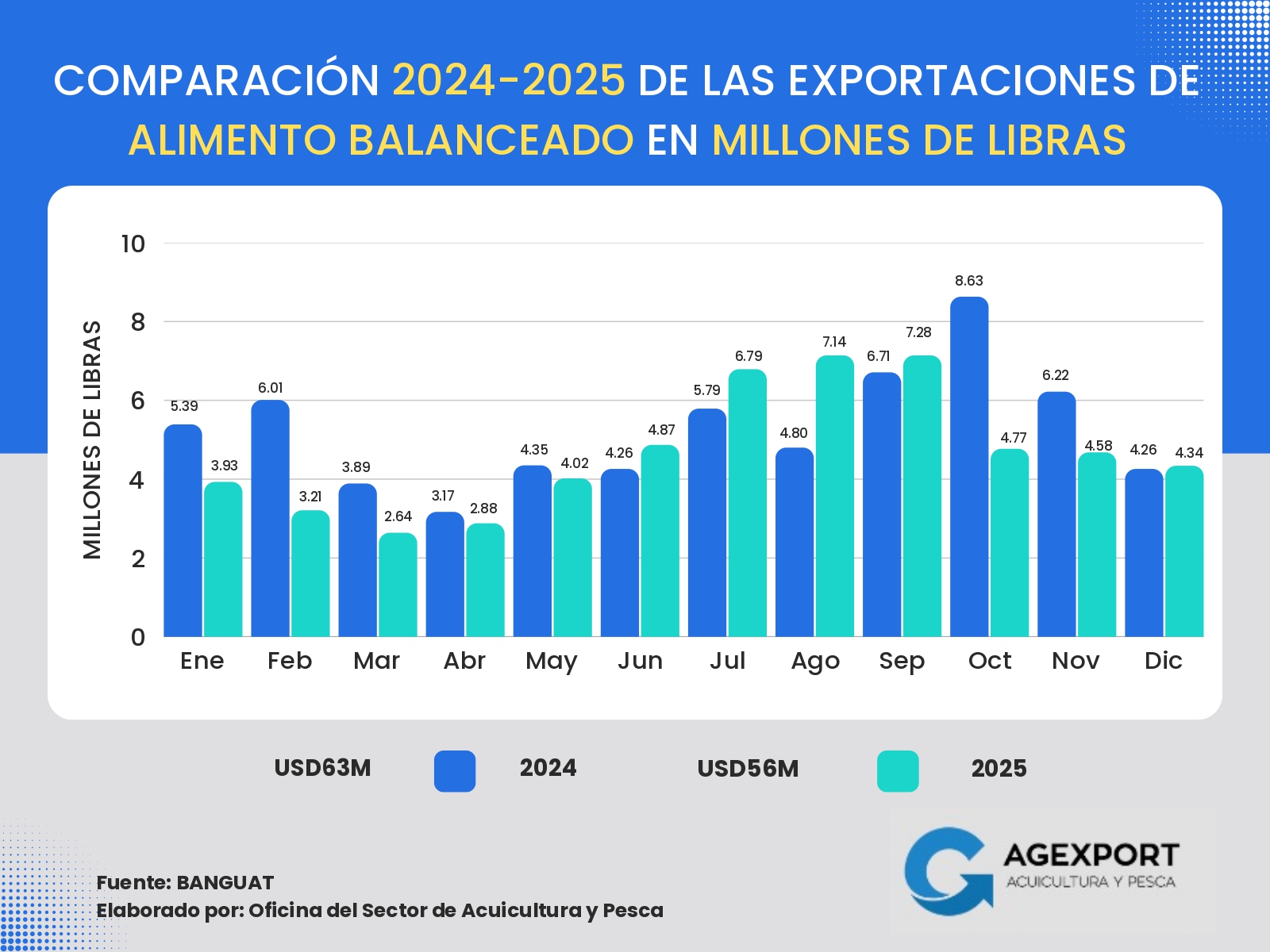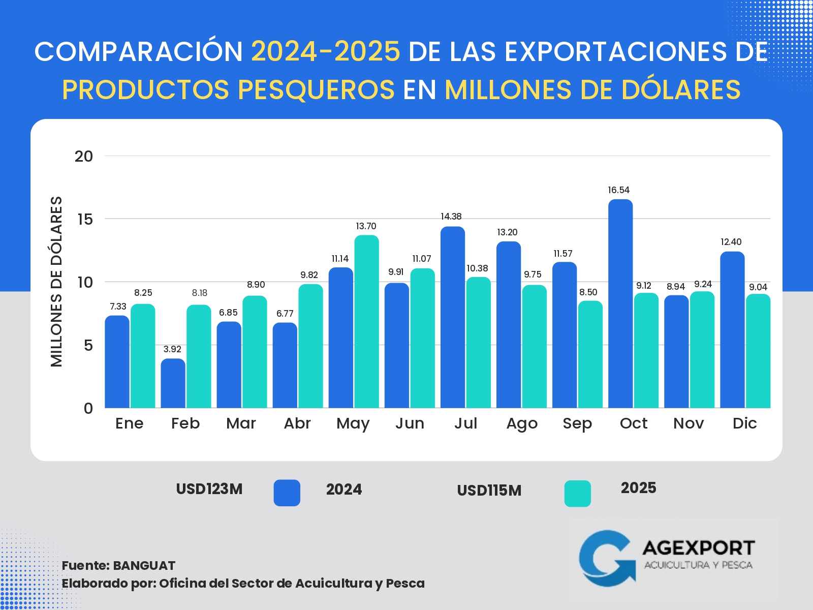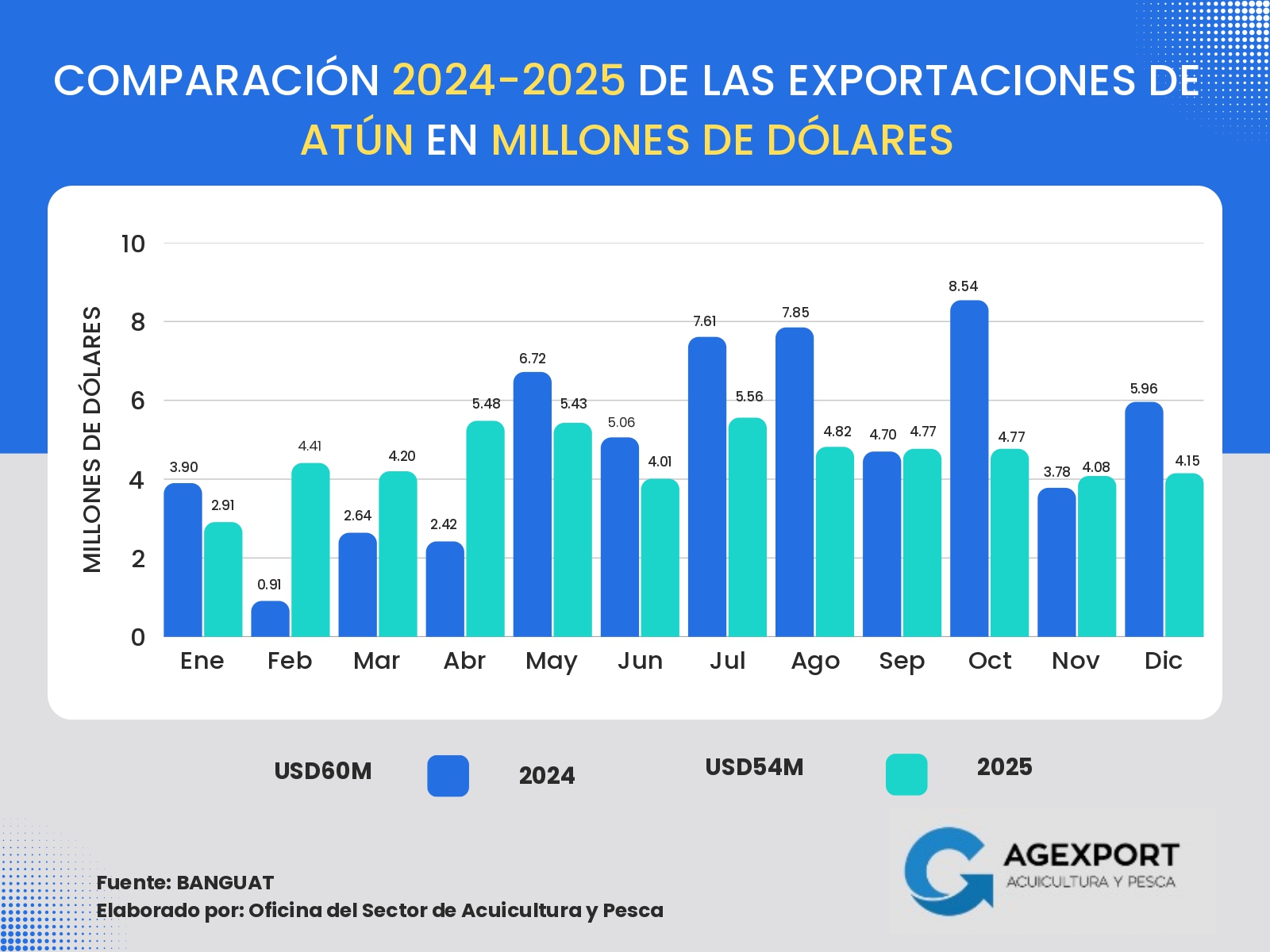 Volumen: A diciembre de 2025 se han exportado 41 millones de libras. Se observa una disminución del 13 % en el volumen exportado de productos pesqueros en comparación con el año 2024 (47 millones de libras a diciembre de 2024).