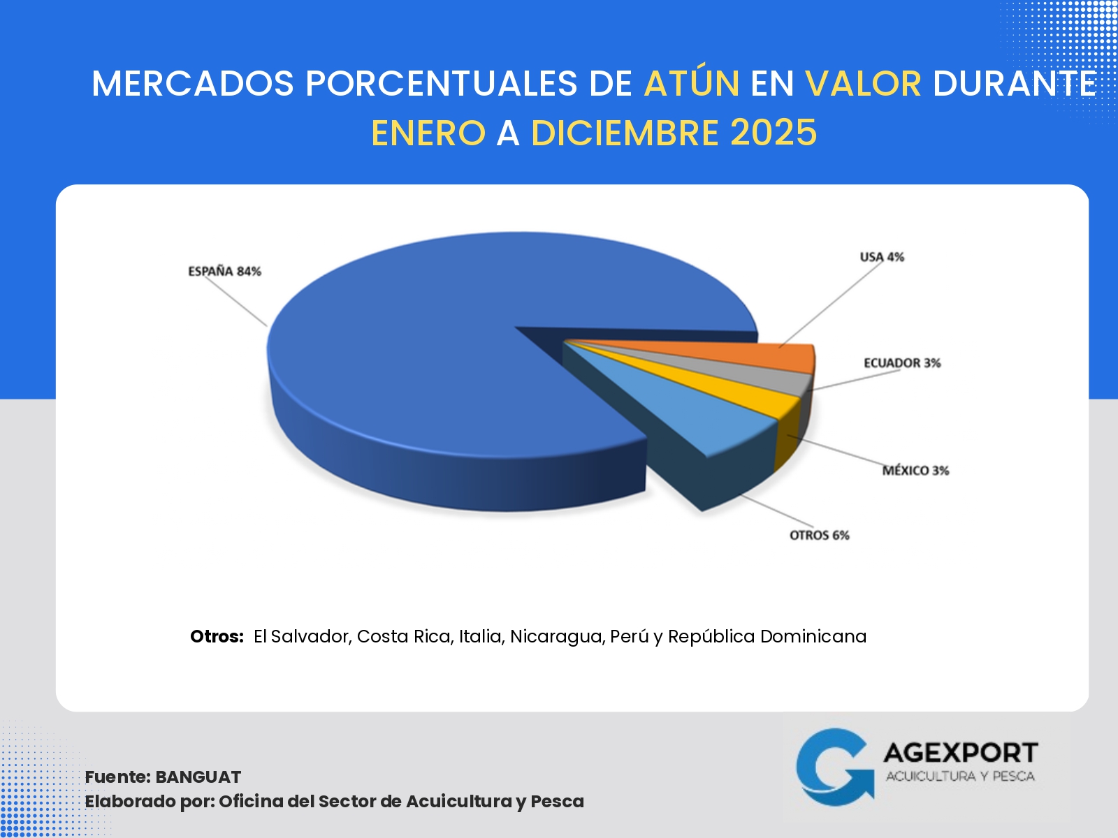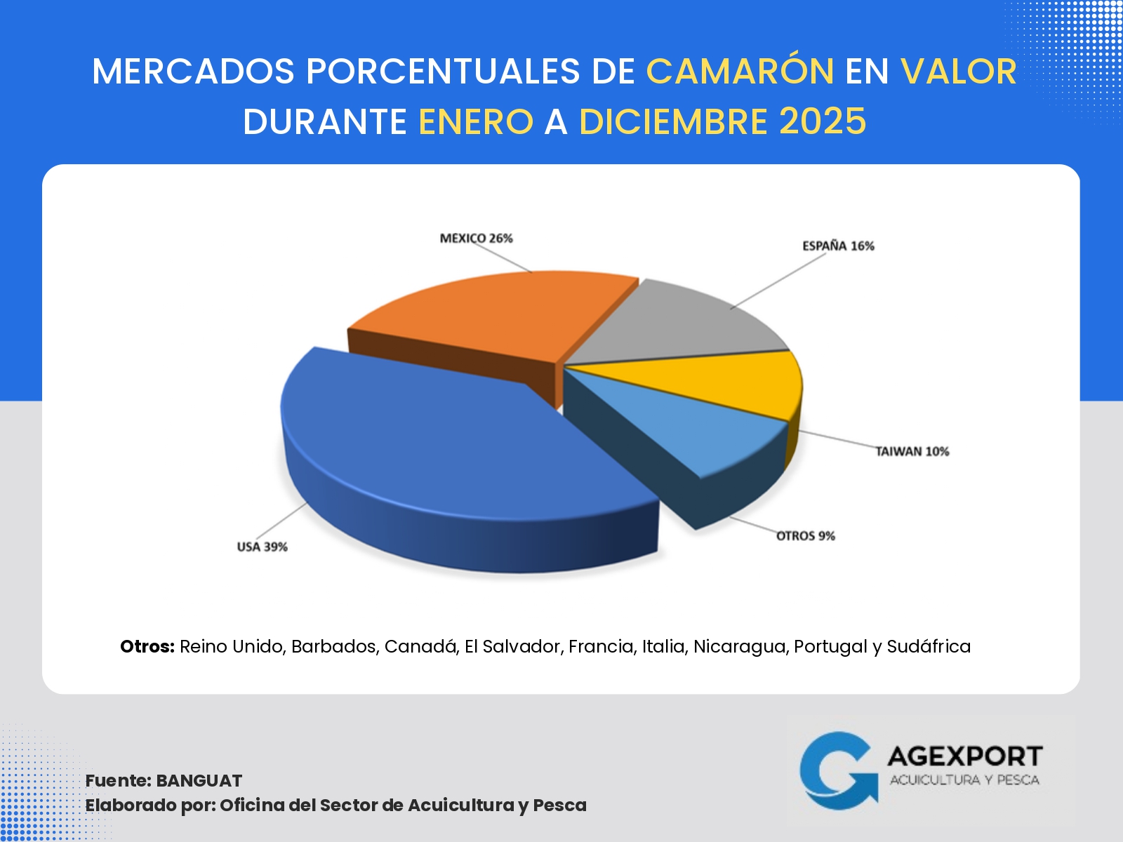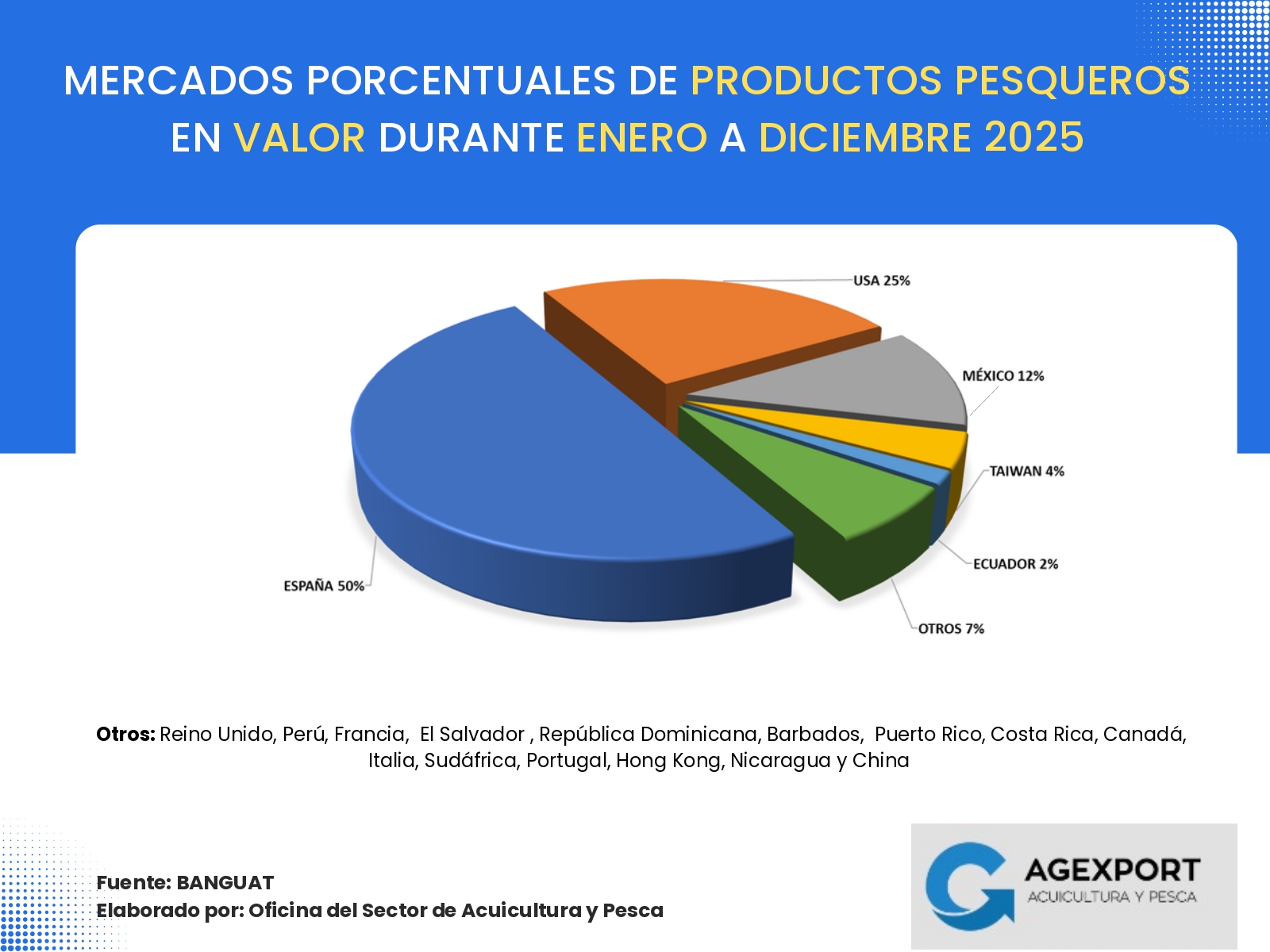 Principales mercados de exportación en valor: España, Estados Unidos, México, Taiwán y Ecuador se mantienen como los principales destinos de las exportaciones pesqueras de Guatemala, concentrando en conjunto el 85 % del total exportado.
