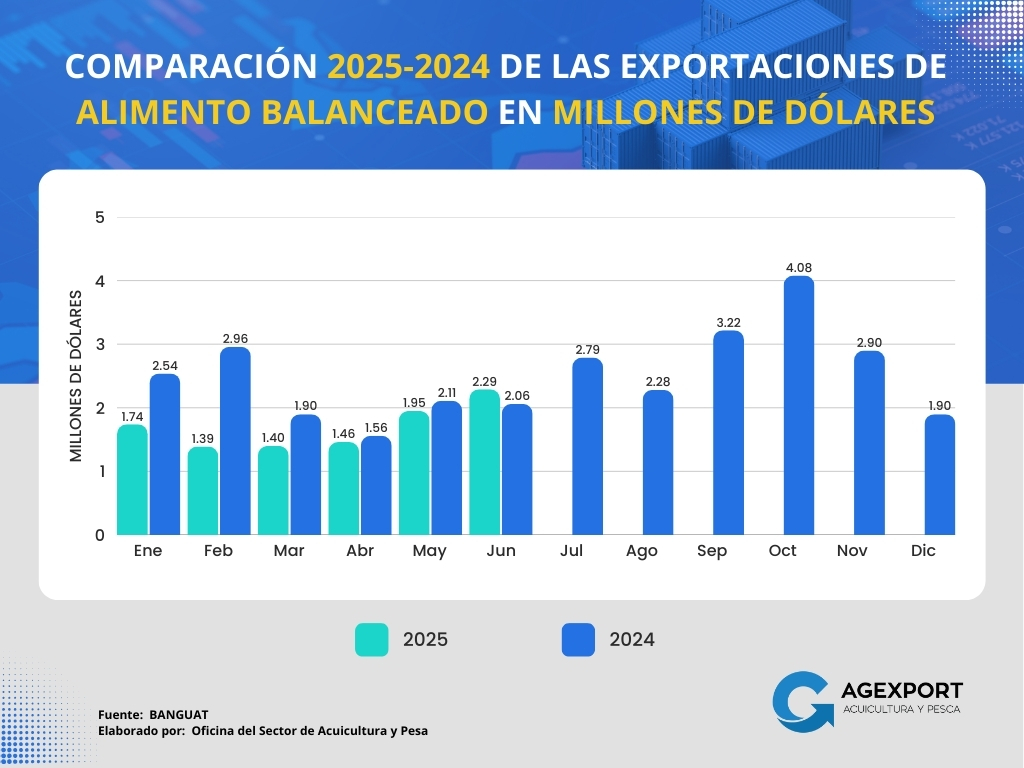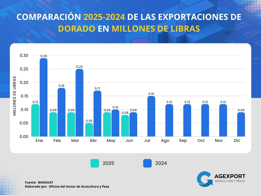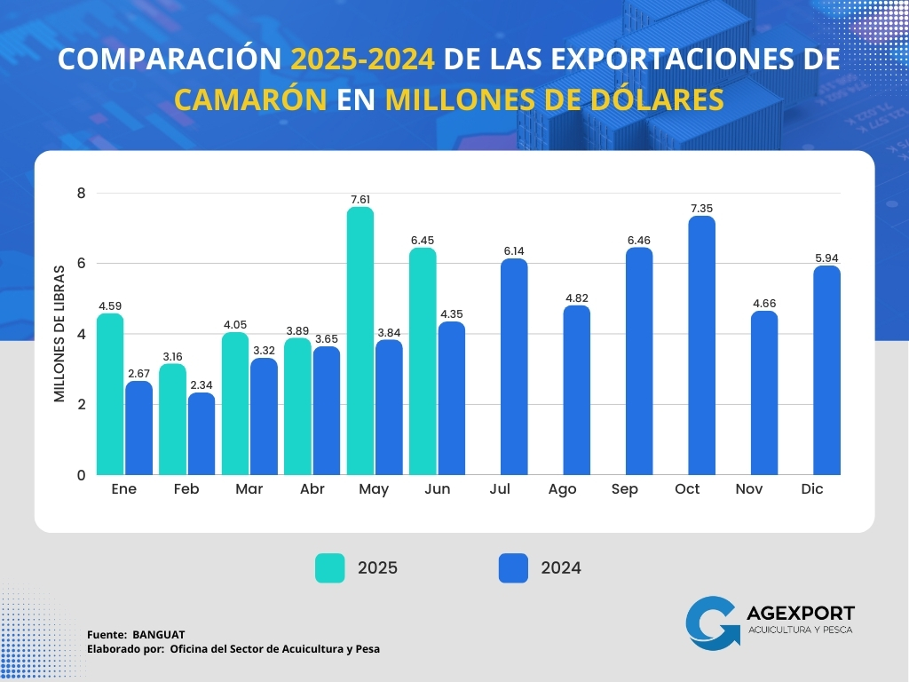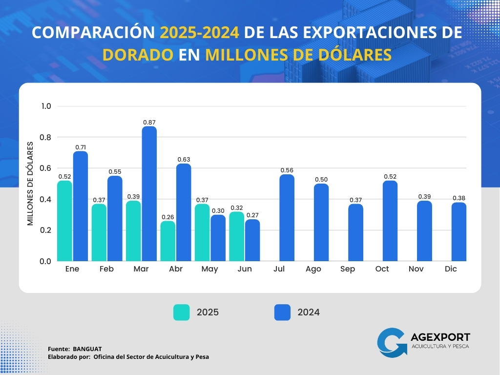 – Valor: A junio 2025, el valor de las exportaciones también mostró un incremento considerable, pasando de 21.63 millones de dólares a junio 2024 a 26.44 millones de dólares en el 2025, lo que representa un aumento del 22%.