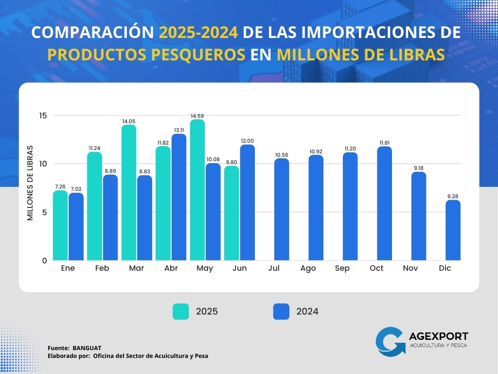 – Volumen: A junio 2025 las importaciones de productos pesqueros experimentaron un incremento del 15% en comparación con el mismo periodo del año anterior (59.93 millones de libras). A junio 2025 se han importado 68.76 millones de libras.