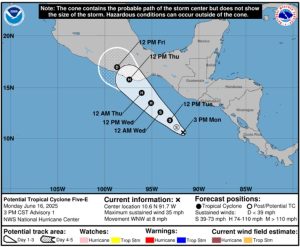 Según el informe emitido hoy a las 3:00 p.m. (CST) por el NHC/NOAA, se prevé que el sistema de baja presión EP94 evolucione a tormenta tropical durante la madrugada del martes y se fortalezca rápidamente hasta convertirse en huracán el miércoles. Este fenómeno podría provocar crecidas de ríos, deslizamientos de tierra e inundaciones, especialmente en las regiones sur y suroccidente del país.